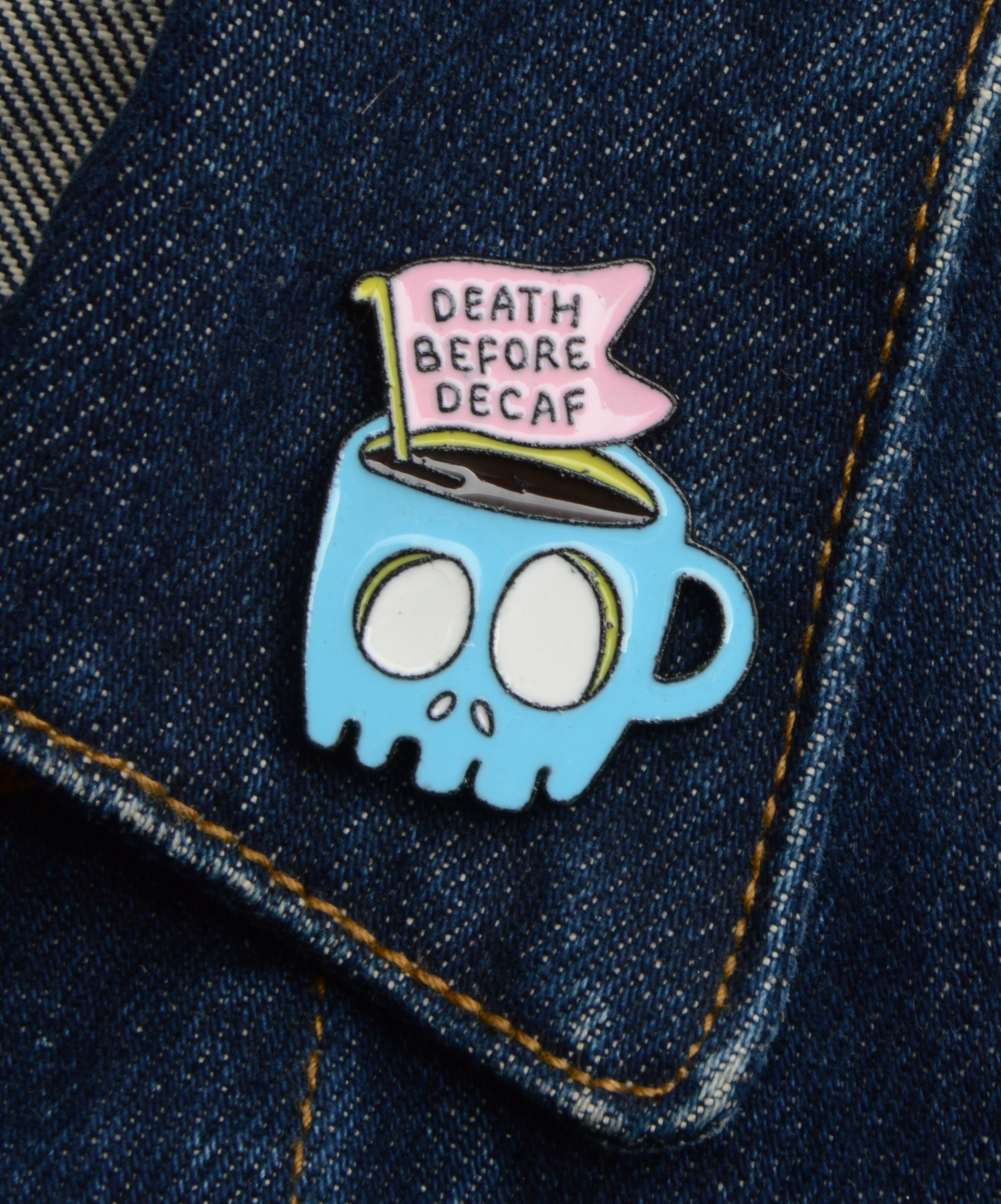 Wake Up with a Smile Embrace your coffee-loving personality with our "Death Before Decaf" pin. This humorous accessory is perfect...