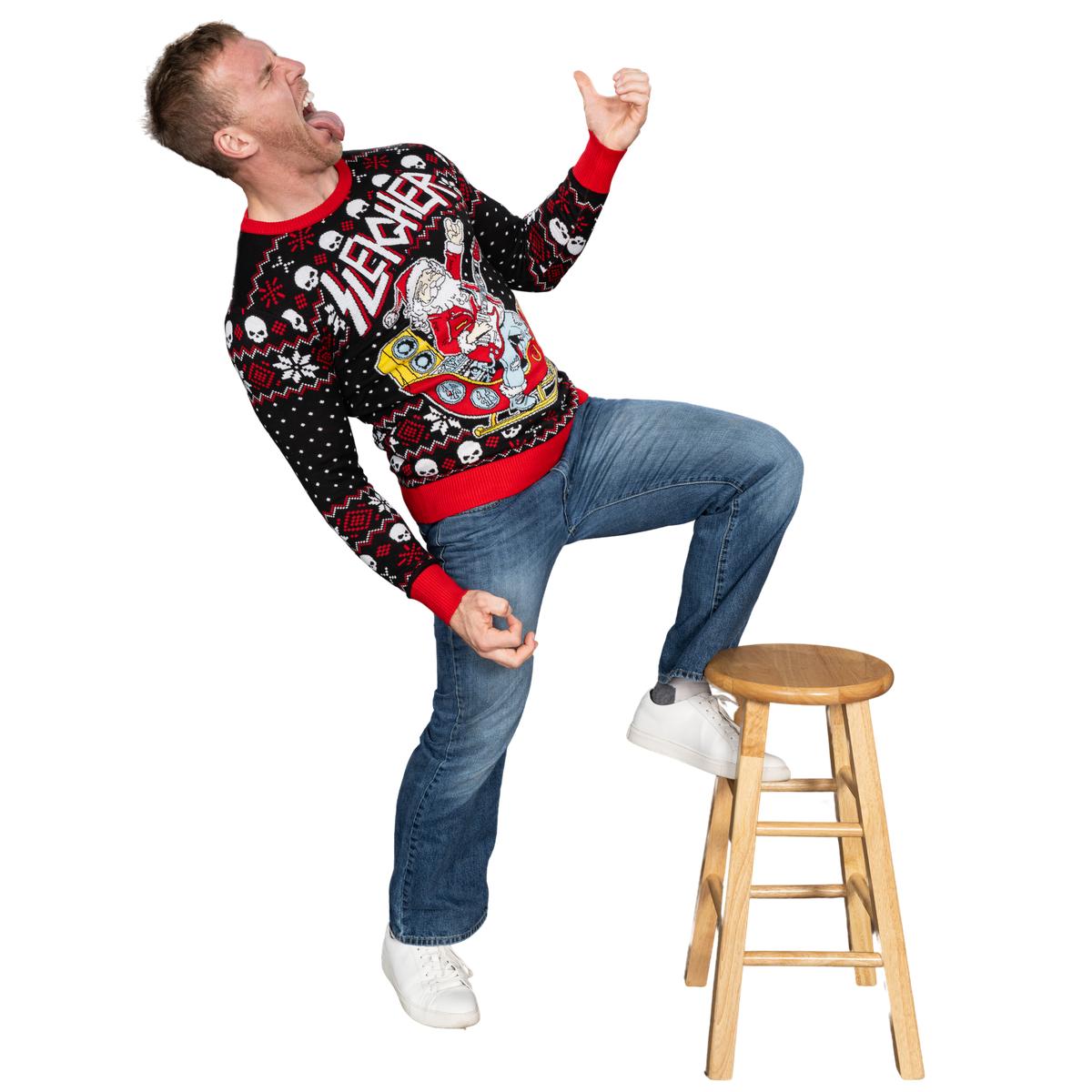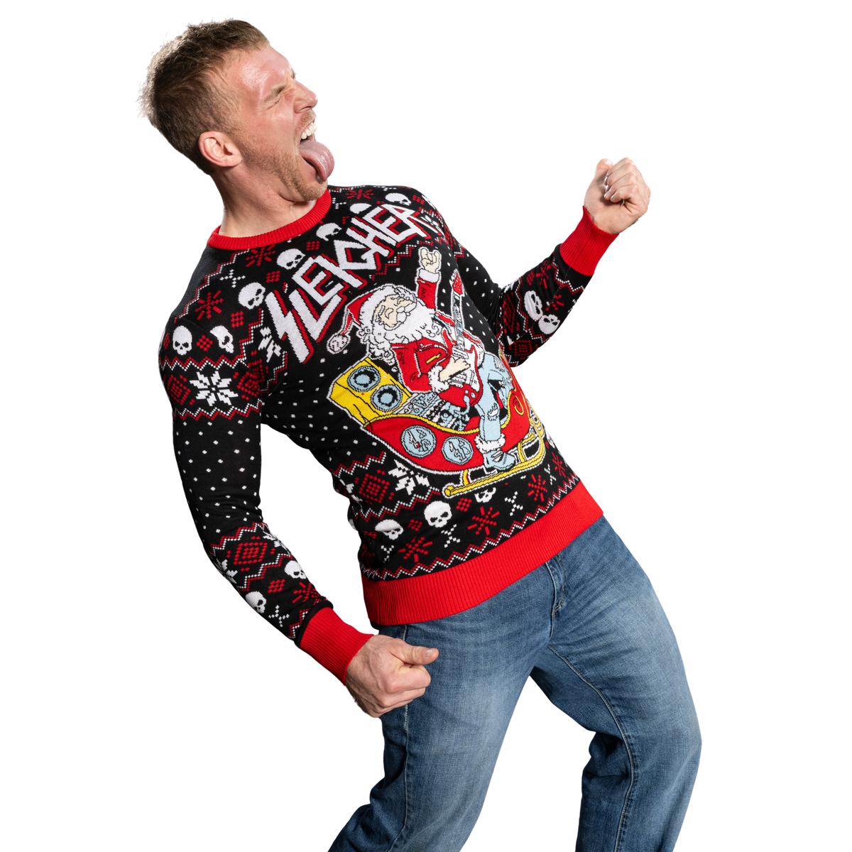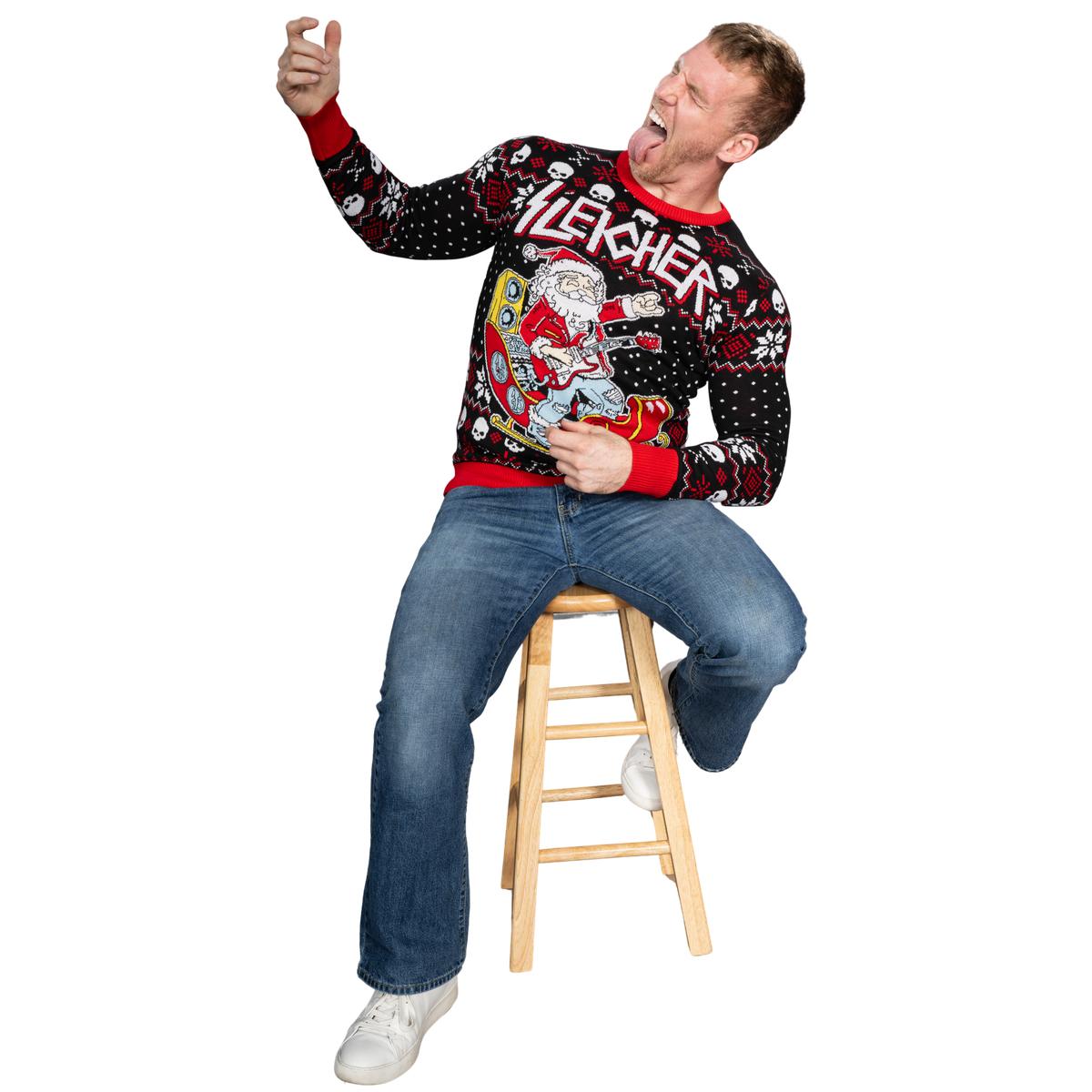 Père Noël rock and roll, guitare, traîneau, pull moche