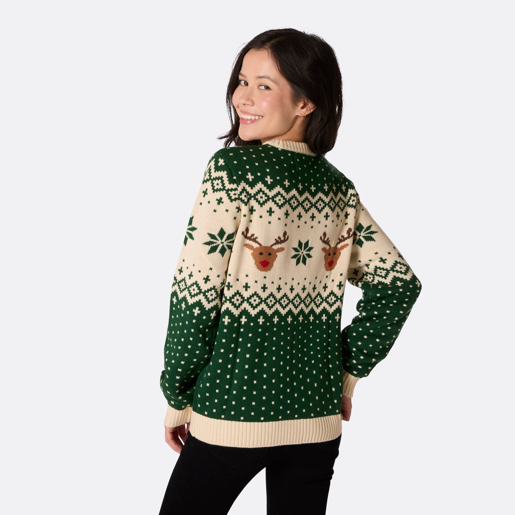 Pull de Noël vert à motif renne rétro pour femme